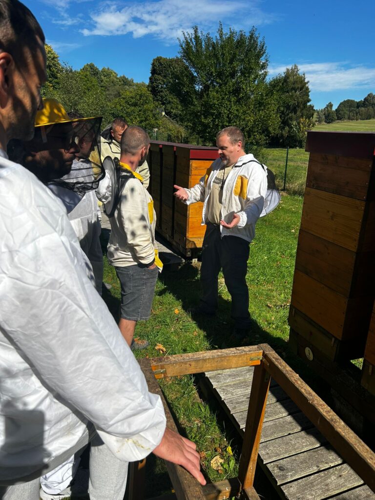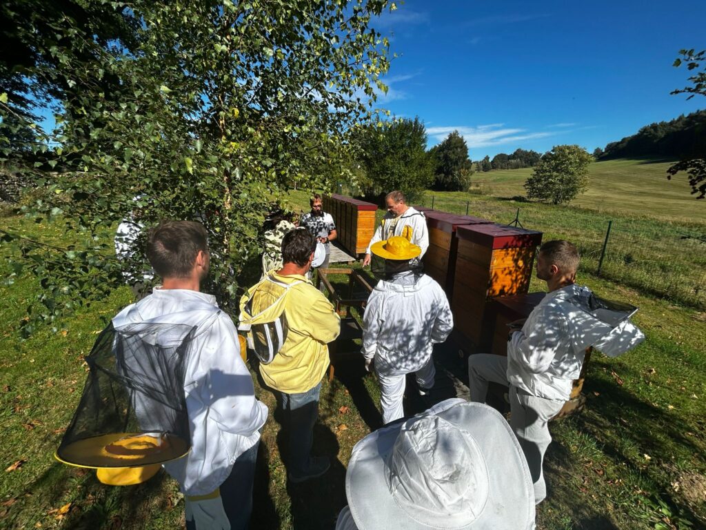 Výuka studentů prvního ročníku oboru Včelař-zpracovatel včelích produktů začala letos v Jihlavě poněkud neobvykle.  O víkendu v doprovodu učitele odborných předmětů Petra Běhunka navštívili jeho včelnici u Větrného Jeníkova. Ta z jedné strany sousedí s prastarým židovským hřbitovem a z druhé s historickým mlýnem uměleckého kováře Leopolda Habermmana. Prostě romantika na plné pecky! Umění vytvořené z chladného kovu se tentokrát prolnulo s chovem včel. „Pochopitelně na exkurzi jsme nezaháleli a učili jsme se stanovit botanickou hodnotu tohoto stanoviště,“ zdůraznil garant oboru Petr Běhunek.